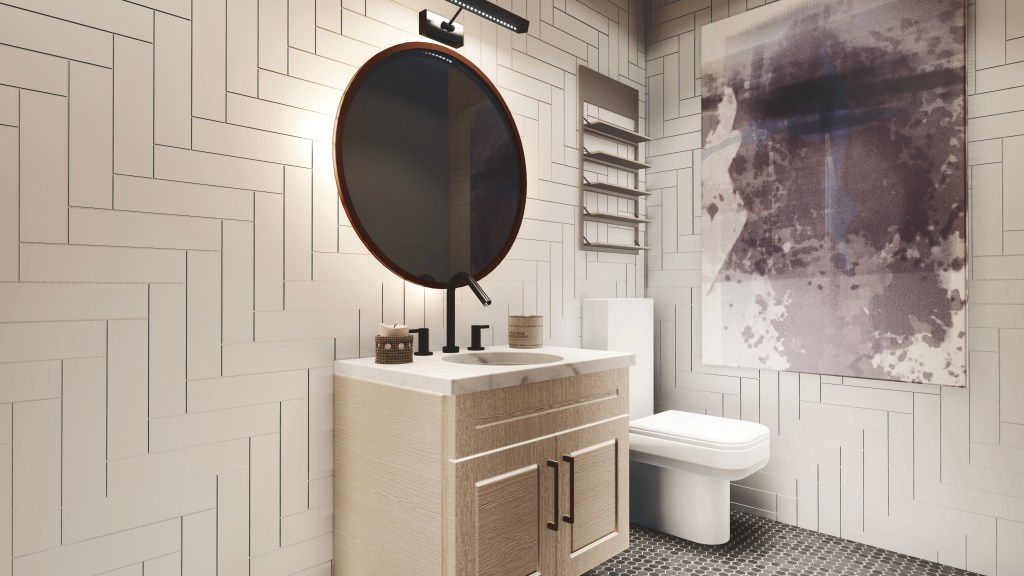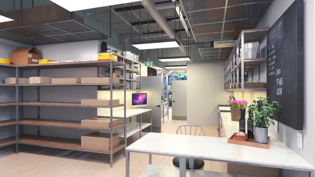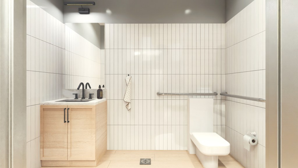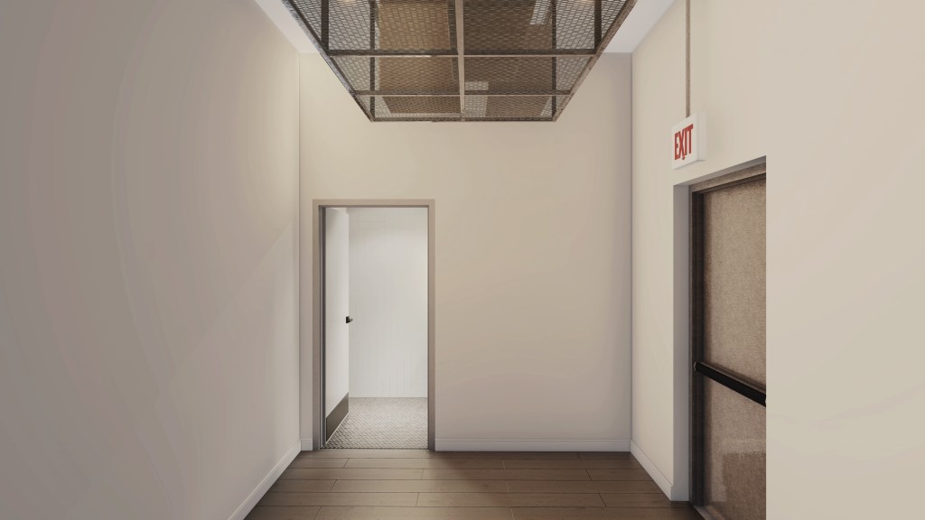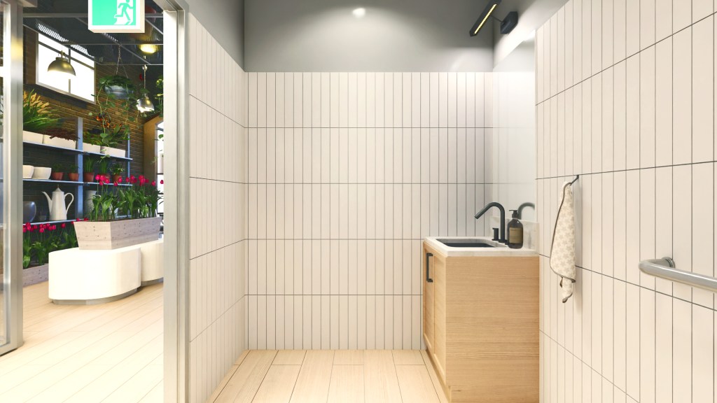 The long tunnel of the unit space has been segregated into a ratio of ¼ of overall area occupied by barrier free washroom storage versus ¾ of overall area for the retail space.