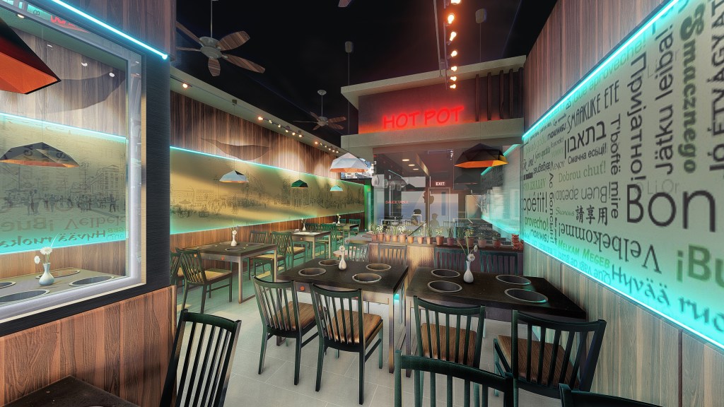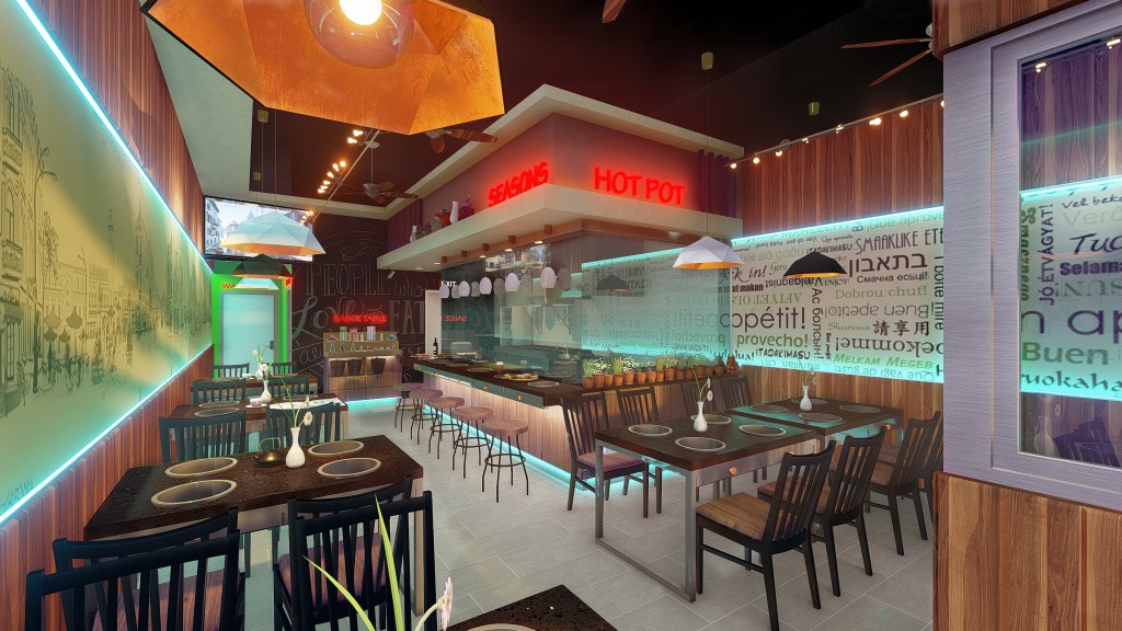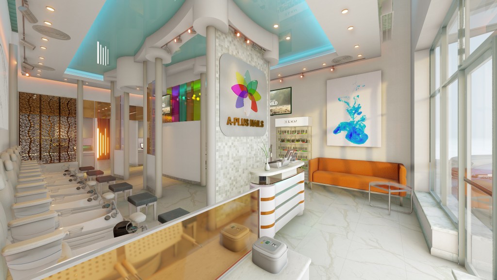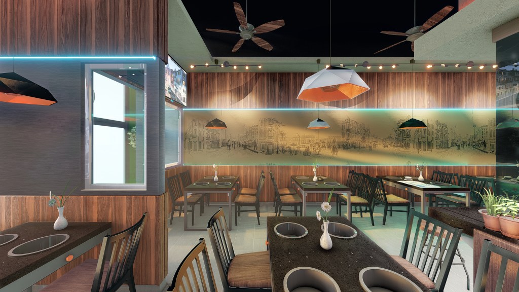 Adjacent partition wall has a false transom, fabricated using the stretched ceiling fabric. Drop ceiling was broken down into three step types slabs.