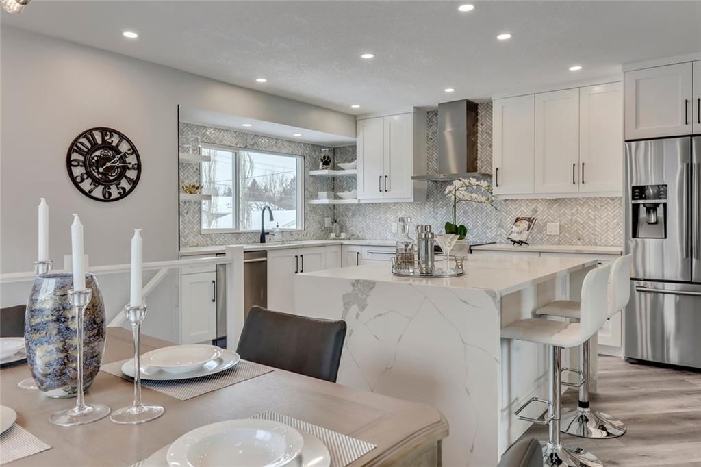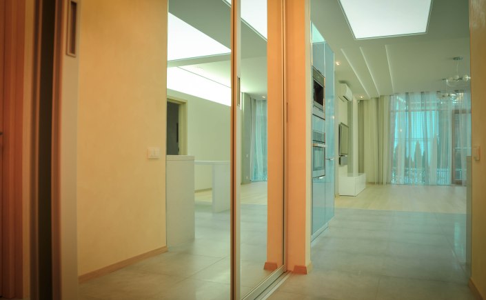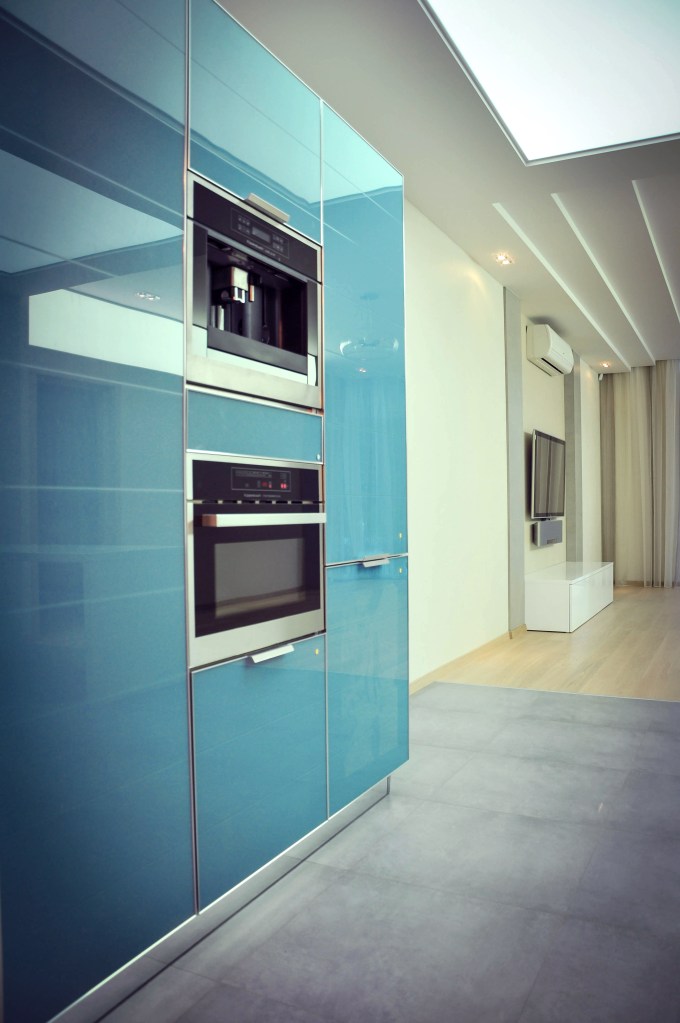 It was selected blue faced cabinets doors with white quartz countertop and eating table.Above dining zone we decided to implement stretched semi-transparent ceiling with LED module evenly spreading illumination.