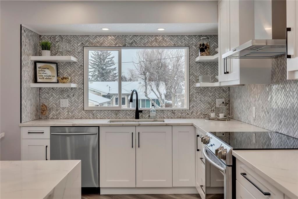 Kitchen walls and floor are faced with fade grey porcelain tiles. As kitchen accent it was selected modern ELICA hood fan.